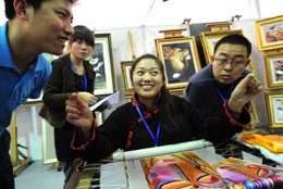 4月18日,一位繡品參展商向參會(huì)者介紹繡品特點(diǎn)。當(dāng)日,天津第十五屆投資貿(mào)易洽談會(huì)拉開(kāi)帷幕。