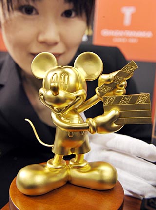 23日,在日本首都東京舉行的迪斯尼公司電影《國家寶藏2》DVD的推廣活動上,工作人員展示一只純金米老鼠。這只米老鼠高12厘米,重一公斤,價值約3.2萬美元,將在迪斯尼公司DVD推廣活動上作為獎品發(fā)放。新華社/法新