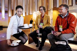 5月4日,青島奧運(yùn)村工作人員在為兩名奧地利運(yùn)動(dòng)員送咖啡。