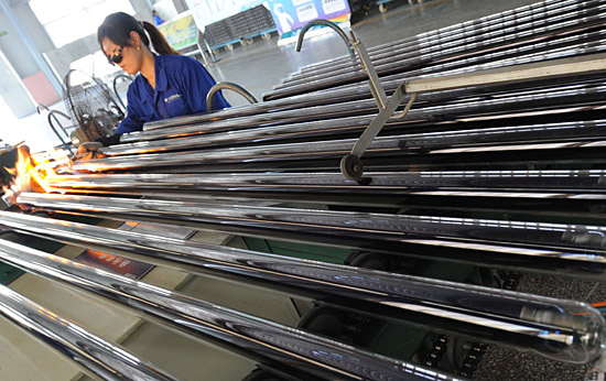 5月7日,工人在加工太陽能全玻璃真空集熱管。