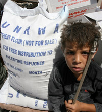5月5日,一名巴勒斯坦兒童在從聯(lián)合國近東巴勒斯坦難民救濟(jì)和工程處在加沙地區(qū)的總部領(lǐng)取救濟(jì)糧后坐上驢車離開。該組織在加沙地區(qū)的發(fā)言人當(dāng)天說,由于燃料短缺,該組織將于當(dāng)天開始再次停止對加沙地帶的食品援助。