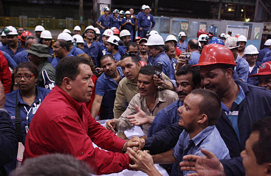 12日,在委內(nèi)瑞拉東南部玻利瓦爾州的奧里諾科鋼鐵公司,委總統(tǒng)查韋斯(左)與鋼鐵工人握手。查韋斯當(dāng)天宣布,委內(nèi)瑞拉政府正式收回奧里諾科鋼鐵公司的控制權(quán)。這標(biāo)志著委內(nèi)瑞拉最大鋼鐵公司的國(guó)有化進(jìn)程邁出實(shí)質(zhì)性一步。新華社/玻利瓦爾通訊社
