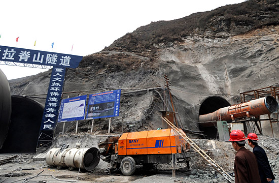 | 兩名施工人員經(jīng)過青海西久公路拉脊山隧道施工區(qū)(5月13日攝)。我國(guó)首條高嚴(yán)寒、高海拔超長(zhǎng)公路隧道——青海西久公路拉脊山隧道施工進(jìn)展順利,最快速度日掘進(jìn)可達(dá)5米。2007年9月開工建設(shè)的拉脊山隧道總投資達(dá)5億多元,全長(zhǎng)超過9公里,其中主洞長(zhǎng)5.5公里,隧道全段將按二級(jí)公路標(biāo)準(zhǔn)建設(shè),設(shè)計(jì)行車速度為每小時(shí)40公里,預(yù)計(jì)2009年完工。 | |