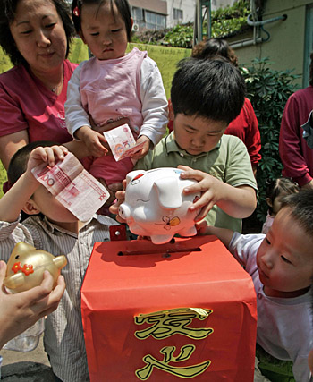 5月15日,天津和平區(qū)保育院的兒童帶著自己的存錢罐,向四川地震災(zāi)區(qū)捐獻(xiàn)自己的“積蓄”。