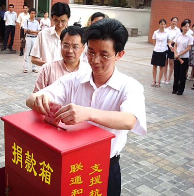 5月14日,中國聯(lián)通漳州分公司舉行了向“四川汶川地震”災區(qū)捐款活動,當天共收到員工捐款78250元。同時,該公司還在四川籍外來工集中的工作區(qū)、生活區(qū)免費發(fā)送關(guān)于地震的最新動態(tài)消息,并現(xiàn)場擺放免費無線電話。同時倡議廣大聯(lián)通客戶將積分兌換成現(xiàn)金捐贈給災區(qū)人民。