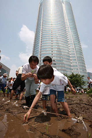 17日,在日本東京六本木新城的屋頂庭園里,小朋友們在工作人員的指導(dǎo)下體驗(yàn)插秧。六本木新城的屋頂庭園每年都向工作人員的家屬和附近居民提供體驗(yàn)插秧的機(jī)會。