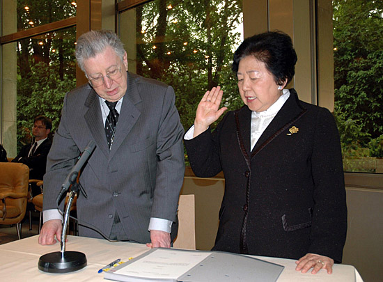 | 20日,中國律師張月姣(右)在日內(nèi)瓦世界貿(mào)易組織總部宣誓,正式就任世貿(mào)組織上訴機(jī)構(gòu)法官。上訴機(jī)構(gòu)是世貿(mào)組織負(fù)責(zé)貿(mào)易爭端裁決的最高機(jī)構(gòu),由7名法官組成。這是中國內(nèi)地律師首次在世貿(mào)組織中擔(dān)任這一重要職務(wù)。 | |