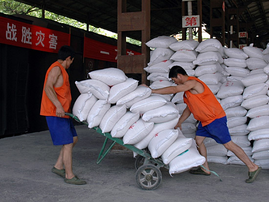 為保證地震災(zāi)區(qū)群眾和救災(zāi)人員糧食供應(yīng),中儲(chǔ)糧總公司決定向?yàn)?zāi)區(qū)緊急捐贈(zèng)的3000噸大米,將于5月25日、26日全部抵達(dá)目的地。圖為中儲(chǔ)糧湖南分公司職工在裝載賑災(zāi)大米。