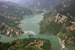 唐家山一帶受阻河道水面上升較快。由于水量過大,一旦堤壩坍塌會(huì)對(duì)下游構(gòu)成極大威脅。新華社記者:王建民 攝
