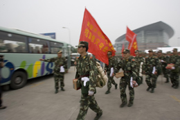 5月25日,武警水電部隊(duì)官兵在綿陽機(jī)場(chǎng)的營(yíng)地,準(zhǔn)備上車駛往唐家山堰塞湖方向。新華社記者:朱煒 攝