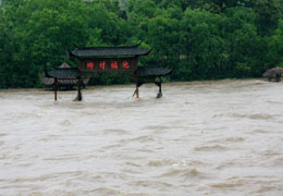 6月10日,休寧縣溪口鎮(zhèn)陽干村前的牌樓已經被洪水淹沒大半。