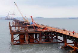 全面貫通的福建省平潭海峽大橋施工棧橋。福建平潭海峽大橋自2007年11月開工建設以來,經(jīng)過600多名建設者日夜奮戰(zhàn),大橋施工用棧橋于近日全線貫通,進入主橋橋墩海底施工階段,這標志著大橋主體施工進入快車道?偼顿Y為11億多元,建設工期3年的平潭海峽大橋地處福建東部,連接內(nèi)陸福清市與福建第一大島嶼——平潭島,大橋全長3500米,設計為雙向4車道,是進出平潭島的最便捷通道。