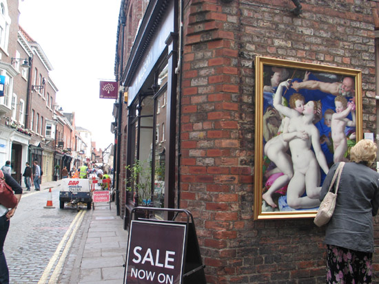 2日,在英國中部的歷史古城約克,一名婦女在欣賞掛在街頭墻壁上的一幅世界名畫。近日,以藝術(shù)收藏聞名的英國國家美術(shù)館與約克藝術(shù)館合作推出了為期三個(gè)多月的“教育旅行”活動(dòng),精選49幅世界著名畫家的作品,擺放在約克市中心,讓世界名作走出畫廊,來到民間,融入大眾生活。