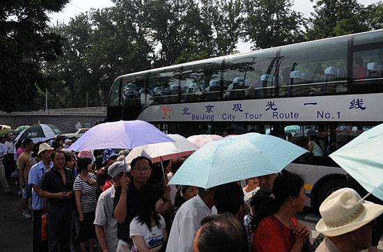 7月20日,乘客在觀光專線的北官廳站排起長隊(duì)等待乘車。當(dāng)日,北京開通兩條奧運(yùn)觀光專線,供國內(nèi)外游客奧運(yùn)期間游覽奧運(yùn)場館和北京市內(nèi)的名勝景點(diǎn)。
