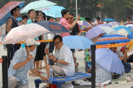 7月24日中午,在北京奧林匹克中心區(qū)奧運(yùn)門(mén)票售票點(diǎn),市民們冒著酷暑排隊(duì)等候購(gòu)買(mǎi)奧運(yùn)門(mén)票。 北京奧運(yùn)會(huì)最后82萬(wàn)余張比賽門(mén)票將于7月25日起通過(guò)設(shè)在各奧運(yùn)場(chǎng)館的售票亭面向公眾發(fā)售,其中有25萬(wàn)張是北京地區(qū)的比賽門(mén)票,其余均為在上海、天津、沈陽(yáng)、秦皇島舉行的足球比賽門(mén)票。為買(mǎi)到門(mén)票,部分市民從23日中午就開(kāi)始在奧運(yùn)門(mén)票售票點(diǎn)排隊(duì)等候。 |