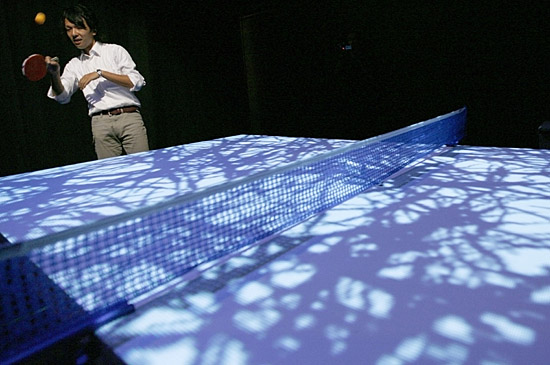 在日本橫濱市舉行的“橫濱Eizone”媒體預(yù)展上,一名男子體驗(yàn)“數(shù)字乒乓”。“數(shù)字乒乓”是一個(gè)互動(dòng)式藝術(shù)品,每當(dāng)乒乓球觸及臺(tái)面,投射在臺(tái)面上的數(shù)字影像都會(huì)隨之改變。“橫濱Eizone”將向人們展示最先進(jìn)的動(dòng)畫、flash等數(shù)字信息技術(shù)。新華社/路透