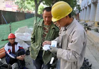 兩位在寧夏銀川市興慶區(qū)進寧街工地上干活的農(nóng)民工正在仔細觀看“勞動合同法撲克”。5月31日,銀川市興慶區(qū)職工幫扶救助中心正式成立,工作人員立即將印有“勞動合同法”的撲克發(fā)放給附近的農(nóng)民工,旨在讓更多農(nóng)民工了解勞動合同法,合理合法保護自身權(quán)益。新華社記者:武勇 攝 |