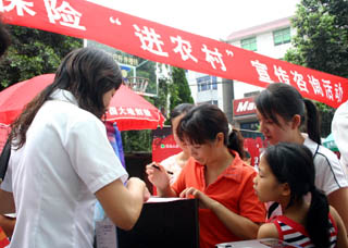 2008年6月27日,福建省一些保險公司的工作人員正在向閩清縣白樟鎮(zhèn)的居民介紹保險知識。當日,福建保監(jiān)局、福建省保險學會、福建省保險行業(yè)協(xié)會及9家保險公司共120多人在白樟鎮(zhèn)開展了“保險進農(nóng)村”宣傳活動。新華社記者:康淼