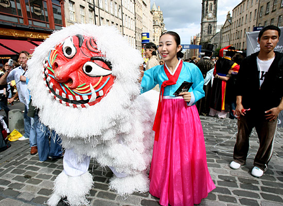 2日,在英國蘇格蘭首府愛丁堡,韓國演員與韓國舞獅演員在街頭向游客介紹即將在愛丁堡邊緣藝術(shù)節(jié)上演出的歌舞節(jié)目。今年的愛丁堡邊緣藝術(shù)節(jié)于3日正式拉開帷幕,一直持續(xù)到25日,藝術(shù)節(jié)上獨(dú)具東方特色的文化和藝術(shù)吸引了眾多關(guān)注。這一藝術(shù)節(jié)是世界上規(guī)模最大的開放性藝術(shù)活動之一。