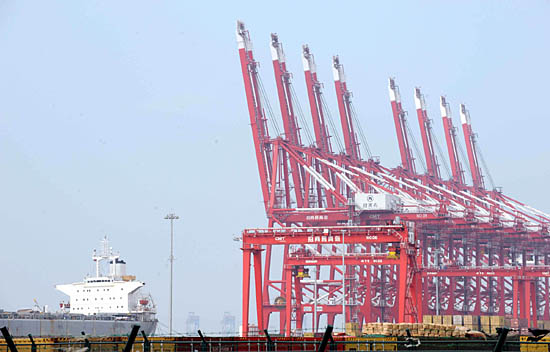 這是青島前灣招商局國際集裝箱碼頭(8月5日攝)。目前,青島保稅區(qū)與招商局國際集裝箱碼頭“區(qū)港聯(lián)動”,實現(xiàn)了碼頭與物流園區(qū)的無縫對接。
