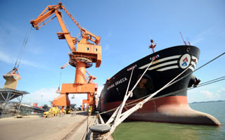 8月13日,一艘外籍貨輪?繗J州港勒溝作業(yè)區(qū)卸貨。據(jù)南寧海關(guān)統(tǒng)計,2008年上半年廣西北部灣經(jīng)濟(jì)區(qū)進(jìn)出口29.9億美元,同比增長83.3%。防城港、南寧、欽州三市分別以12億美元、8.7億美元、6.2億美元位列經(jīng)濟(jì)區(qū)進(jìn)出口前三,其中欽州增速最快,達(dá)1.2倍。 |