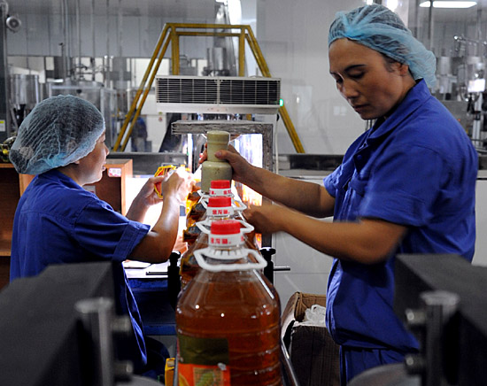 近年來(lái),隨著以進(jìn)口大豆為原料的加工企業(yè)的陸續(xù)落戶(hù),北部灣已成為國(guó)內(nèi)大豆加工新基地。目前,分布在廣西沿海的大豆加工數(shù)量約占全國(guó)比例的15%。圖為廣西防城港市“大海糧油”的員工在生產(chǎn)食用油。