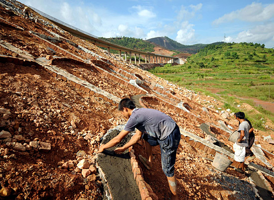 8月27日,建筑工人在修建岑溪至興業(yè)高速公路路基加固墻。未來5年,廣西將投資超過1200億元建設(shè)一批連通周邊國家和鄰省的高速公路。項目建成后,從南寧到長沙只需9小時,到昆明只需8小時,到廣州僅需6個小時。
