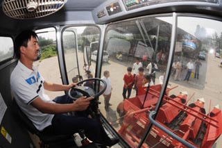 9月3日,在河南省沁陽市農(nóng)機(jī)大世界,遠(yuǎn)大農(nóng)機(jī)專業(yè)合作社理事長王勝會在選購大型玉米聯(lián)合收割機(jī)。秋收臨近,沁陽市采取政府資金補(bǔ)貼、政策扶持等措施,鼓勵農(nóng)民購買大型玉米聯(lián)合收割機(jī)。