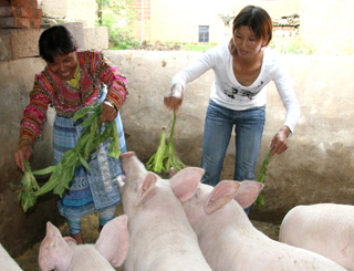 云南開遠(yuǎn)養(yǎng)豬戶母豬領(lǐng)“補貼”。圖為樹木克上寨村彝族養(yǎng)豬戶周華清(右1)在給喂食快出欄的架子豬在政府補助下,她家養(yǎng)豬年獲益4萬多元。新華社記者