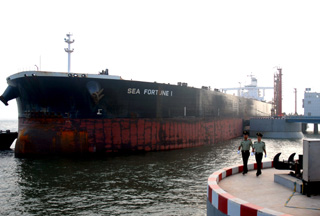 河北省唐山港曹妃甸中石化石油碼頭日前開航。曹妃甸中石化30萬噸級石油碼頭自2006年11月開工建設(shè),2008年7月竣工。碼頭最大可靠泊45萬噸級油輪,接卸原油能力最大可達(dá)每小時1.2萬立方米。圖為河北邊防干警在曹妃甸原油碼頭巡邏。