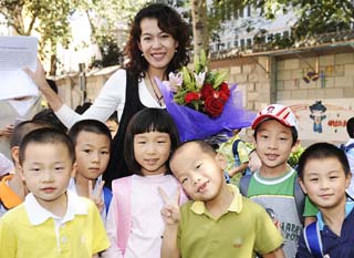 9月10日,在北京第二實(shí)驗(yàn)小學(xué),一名一年級老師手持鮮花在拜師會(huì)后被學(xué)生簇?fù)。?dāng)日,該校在一年一度的教師節(jié)之際舉行拜師會(huì),一年級新生正式向任課老師行拜師禮。