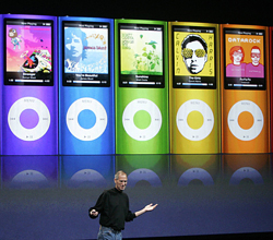 9日,在美國加利福尼亞州的舊金山,蘋果公司首席執(zhí)行官史蒂夫·喬布斯在該公司的“Let‘s Rock”新品發(fā)布會上展示新一代ipod Nano播放器。
