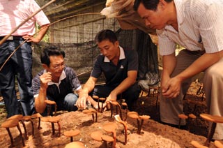 9月18日,海南省瓊中黎族苗族自治縣承信農(nóng)業(yè)開發(fā)有限公司技術(shù)員唐望賢(右二)和縣農(nóng)業(yè)技術(shù)推廣中心副主任李茂才(右一)在該縣營根鎮(zhèn)新豐村向農(nóng)民傳授靈芝種植技術(shù)。瓊中黎族苗族自治縣地處海南五指山深處,是國家級貧困縣。該縣農(nóng)業(yè)技術(shù)推廣中心和瓊中縣承信農(nóng)業(yè)開發(fā)有限公司無償向當?shù)厝齻鄉(xiāng)鎮(zhèn)的30余戶農(nóng)民提供靈芝種植技術(shù)和種苗,幫助農(nóng)民開拓新的生產(chǎn)致富門路。 |