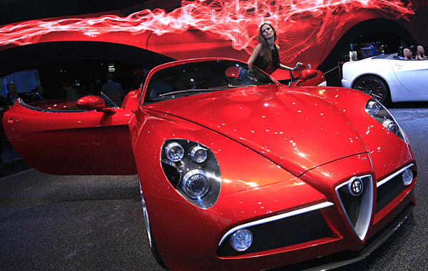 3日,一名模特在2008巴黎國際車展上展示Alfa Romeo的跑車8C。當天是巴黎國際車展的媒體開放日。本次車展吸引了25個國家的362個品牌參加,從4日至19日向公眾開放。作為世界上最具影響力的車展之一,上屆巴黎車展吸引了約150萬名觀眾。