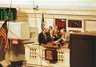 道—瓊斯指數(shù)1999年3月16日盤(pán)中突破1萬(wàn)點(diǎn)大關(guān);3月29日以10006.78點(diǎn)報(bào)收,歷史性地站在萬(wàn)點(diǎn)之上。圖為16日當(dāng)時(shí)的紐約市長(zhǎng)等為紐約證券交易所收盤(pán)。