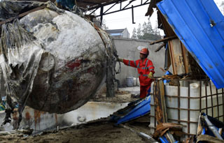 10月7日中午,上海奉賢區(qū)金匯鎮(zhèn)發(fā)生一起廢棄三氯化磷儲罐泄漏事故,造成周邊一些群眾氯化氫中毒。目前,污染源已徹底清除,空氣質(zhì)量達標,無危重病人,部分受傷群眾已康復出院。圖為10月8日,環(huán)保人員對發(fā)生泄漏的儲罐進行調(diào)離處置。
