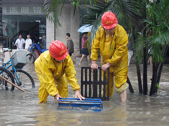 10月14日,兩名市政工人在?谑旋堌S路口疏通下水管道并設(shè)置標(biāo)識(shí),以防行人不慎跌入。 從11日開始,海南受冷空氣和南海熱帶擾動(dòng)的共同影響,連續(xù)四日暴雨強(qiáng)風(fēng),東部和中部部分地區(qū)降雨量超過300毫米,導(dǎo)致12個(gè)市縣受災(zāi)嚴(yán)重,目前已有2人在暴雨中遇難。 | |
