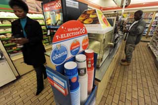 20日,在美國(guó)首都華盛頓國(guó)會(huì)山,印有美國(guó)民主黨總統(tǒng)候選人奧巴馬和共和黨總統(tǒng)候選人麥凱恩名字的一次性紙杯被擺放在一家7-11便利店里。顧客可以根據(jù)自己的傾向選擇其一盛取咖啡。當(dāng)天,印有奧巴馬名字的紙杯在這場(chǎng)全國(guó)范圍內(nèi)舉行的“咖啡杯競(jìng)賽”中以60%的“支持率”居領(lǐng)先地位。