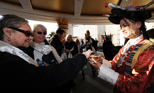 10月28日,一名藏族姑娘為美國(guó)游客敬獻(xiàn)青稞酒。