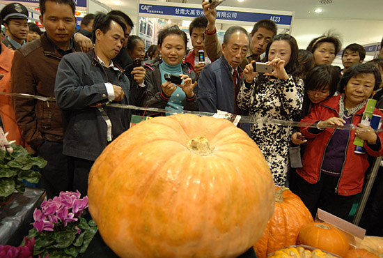 | 11月5日,參觀者在楊凌農(nóng)高會上觀看甘肅天水一家企業(yè)選育的、重達96公斤的太空南瓜。當日,第十五屆中國楊凌農(nóng)業(yè)高新科技成果博覽會在“農(nóng)科城”陜西楊凌開幕,共有5700多個農(nóng)業(yè)科技項目在展會上亮相。來自27個國家和地區(qū)及國內(nèi)26個省區(qū)市的900多家企業(yè)參展參會。據(jù)介紹,自1994年起,楊凌農(nóng)高會已連續(xù)成功舉辦了14屆,年均參會人數(shù)達到130萬人次,經(jīng)濟效益累計達1400多億元。 | |