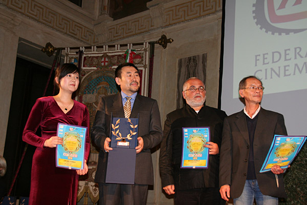 5日,中央新聞紀(jì)錄電影制片廠廠長高峰(左二)與影片導(dǎo)演顧筠(左一)在頒獎現(xiàn)場。當(dāng)日,第26屆國際體育電影電視周在意大利米蘭落幕。由北京奧組委新聞宣傳部監(jiān)制、中央新聞紀(jì)錄電影制片廠拍攝制作的奧運紀(jì)實電影《筑夢2008》,獲本屆電視周的報道紀(jì)錄片單元的最佳影片“榮譽花環(huán)”獎和特別獎項中的影評獎。新華社發(fā)