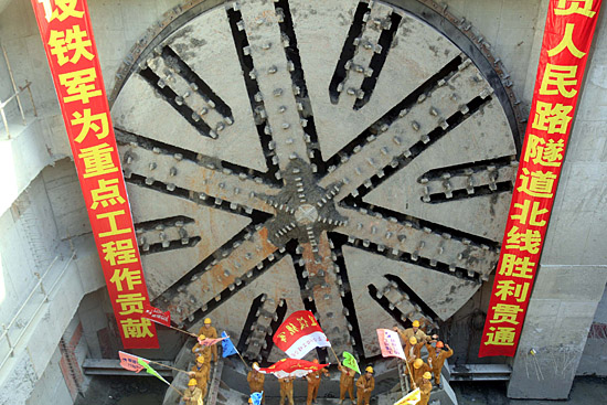 11月9日,上海建工基礎(chǔ)公司的建設(shè)者在人民路隧道浦西接收井慶賀隧道北線貫通。當(dāng)日,2010年上海世博會(huì)配套項(xiàng)目之一的黃浦江又一條越江隧道——人民路隧道江中段北線貫通。人民路隧道全長(zhǎng)3097米,計(jì)劃2009年通車。新華社發(fā)