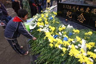 11月12日,一名學(xué)生在青川東河口地震遺址公園向遇難者獻花。