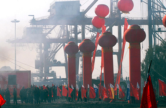 當(dāng)日,總投資超過(guò)100億元的武漢新港建設(shè)在湖北武漢、鄂州、黃岡三地同時(shí)啟動(dòng)4大項(xiàng)目,分別是陽(yáng)邏集裝箱二期擴(kuò)建項(xiàng)目、80萬(wàn)噸乙烯配套碼頭項(xiàng)目、鄂州三和管樁碼頭項(xiàng)目和黃岡唐家渡綜合碼頭項(xiàng)目。以港口項(xiàng)目為主的武漢新港建設(shè),是湖北省應(yīng)對(duì)金融危機(jī)、擴(kuò)大內(nèi)需的重要引擎之一。新華社發(fā) | |