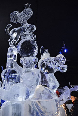 18日,在德國北部城市不來梅,一名俄羅斯藝術(shù)家在雕刻童話《不來梅的音樂家》的冰雕作品。大約40名雕刻者創(chuàng)作了28尊以格林童話為主題的冰雕作品。新華社/法新