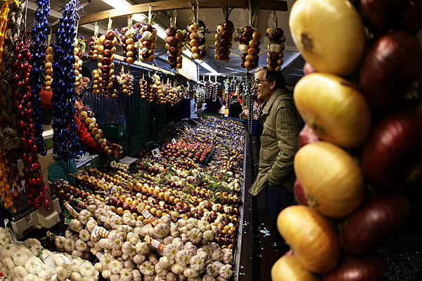24日,在瑞士伯爾尼的洋蔥集市上,一個(gè)攤主銷(xiāo)售自己的貨物。每年11月的第四個(gè)星期一,伯爾尼都舉辦為期一天的洋蔥集市。在今年的集市上,農(nóng)民們一天銷(xiāo)售出50噸左右的洋蔥和大蒜。新華社/路透