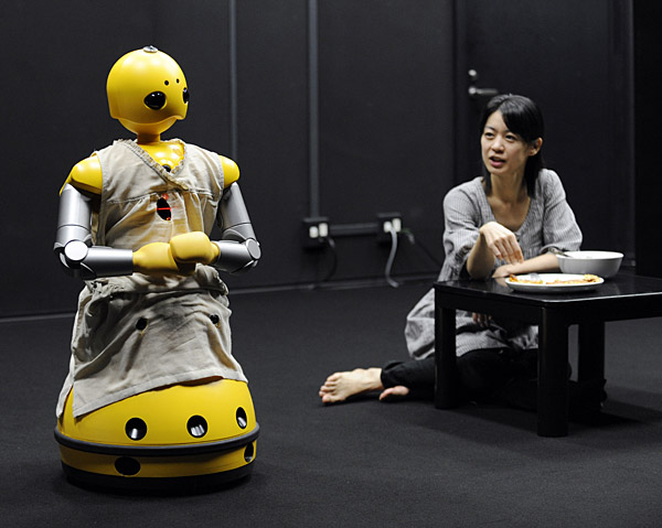 25日,在日本大阪大學(xué),一個(gè)取名為若丸的機(jī)器人與一名女演員同臺(tái)表演。當(dāng)天,這臺(tái)為媒體舉行的20分鐘演出由機(jī)器人與演員共同完成,該劇有可能于明年公演。新華社/法新