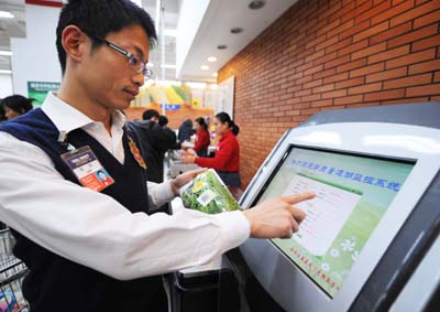 11月30日,超市工作人員在操作蔬菜質(zhì)量追溯系統(tǒng)。