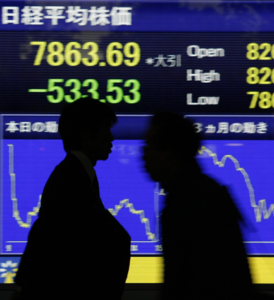 12月2日,人們從日本東京一塊股價顯示牌前走過。受前一個交易日紐約股市暴跌和日元升值等因素影響,日本東京股市日經(jīng)股指2日收盤時下跌6.35%。