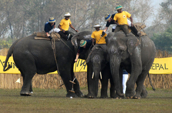 3日,在距尼泊爾首都加德滿都250公里的奇特旺地區(qū)舉行的國際象球錦標(biāo)賽上,雙方隊(duì)員在場(chǎng)上爭(zhēng)搶。象球與普通的馬球相似,但是場(chǎng)地小一些,每方出4名參賽者進(jìn)行兩回合各10分鐘的比賽。騎在大象背上的球員揮動(dòng)長桿擊球。如果大象用它的鼻子拾起球則會(huì)被判犯規(guī)。新華社/法新